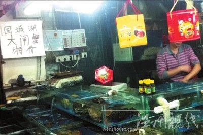 攤位上明晃晃地掛著“陽(yáng)澄湖大閘蟹”禮盒,可隨時(shí)加工。