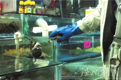 店主從水缸中撈出一只普通蟹,準備為其“戴戒指”,加工陽澄湖大閘蟹。
