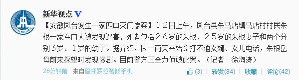 @新華視點報道【安徽鳳臺縣滅門案】2013年12日上午,安徽省鳳臺縣朱馬店鎮馬店村發生村民一家四口遇害的滅門慘案,報道稱遇害者被發現是12日,實際被害時間可能在12日之前,具體案情警方正在偵破。