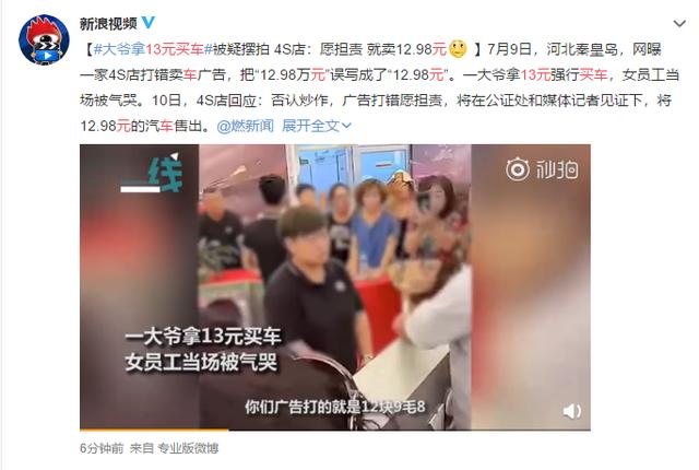 7月9日,河北秦皇島一退休大爺拿著13元到某品牌4S店買車,原來,4S店打廣告時,把“12.98萬元”誤寫成了“12.98元”。有網友懷疑,這是擺拍炒作。