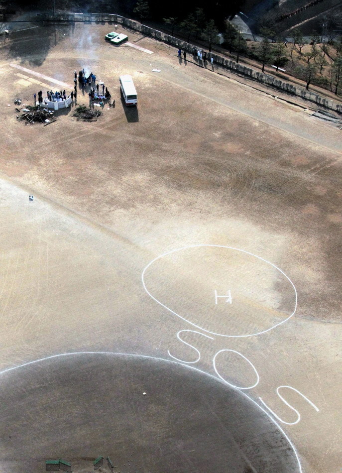日本3.11大地震以后12日在屋頂等待救援的居民,日本地震后的圖片,日本巖手縣在3.11地震和日本海嘯中遭到嚴重損毀,其中高田市接近毀滅。畫面上是3月12日,居民在屋頂上等待救援。
