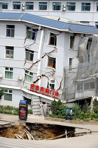 這是8月12日拍攝的路面塌陷情況和門診樓坍塌過程。由于坍塌速度較慢,沒有造成人員傷亡。據太原市政設計院的工作人員初步測量,兩處塌陷中小的一處長7米、寬4米、深6米,大的一處長15米、寬12米、深8米,原因初步判斷為地下管道破裂漏水導致路基受損。